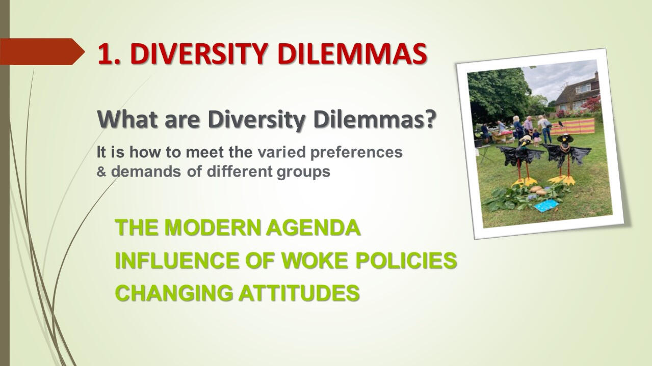 Diversity is divine in extending our experiences but is a dilemma because of the many differences it presents. Studying these brings awareness and the possibility of acceptance and adjustment. The following issues need addressing:Communication issues - diverse groups mean communication challenges from problems in different interacting & operating styles