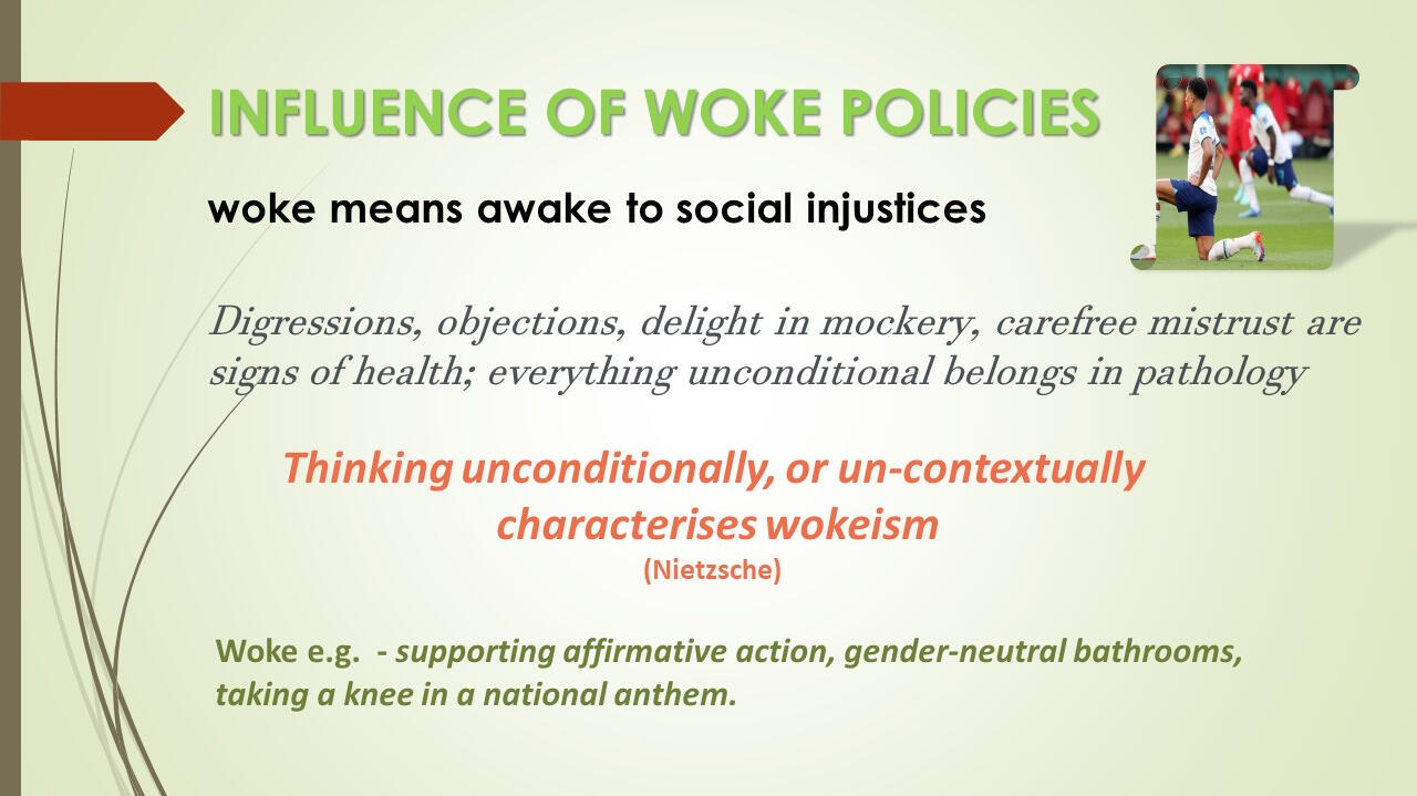 Give an example of woke policy and practice from your experience, and reflect on the result (Levels 2, 3, 4)