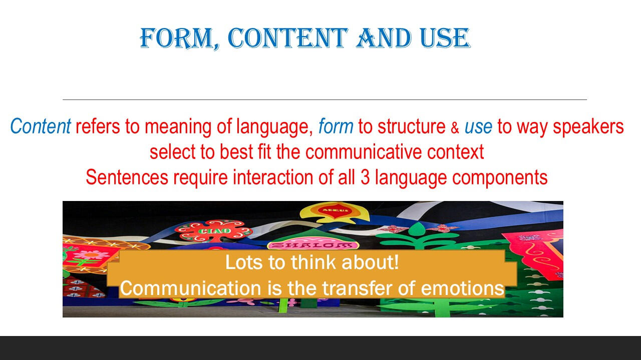 Language is often characterised as having 3 interrelated components: form, content & use (Bloom & Lahey, 1978). Form refers to the structure of language, content is the meaning of language and use is the way speakers select different forms that best fit the communication context.Form – is a vital set of standard features and structures that inform users about how to communicate with an audience. They can choose to follow or ignore these standards, depending on the content they are creating.